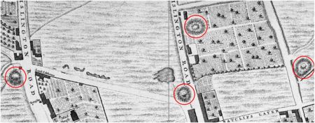 Section of Rocque’s map of 1747 showing the laystall mounds in the vicinity of the Islington Roads to the north ofLondon(the lower mound in the centre is possibly the ‘Mountmill’ in question as a road of that name is just to the south of this area).